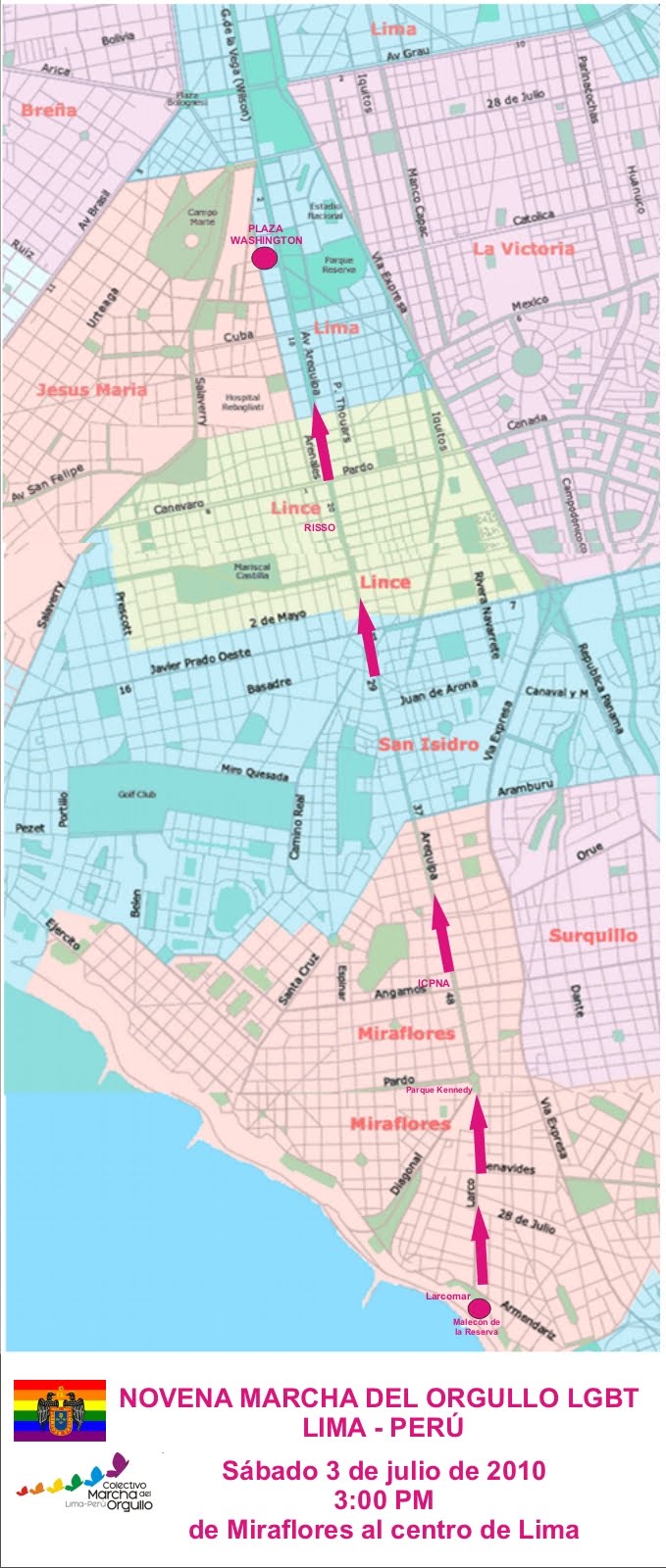 DiariodeLimaGay - 03 de junio de 2010La novena edición de la Marcha del Orgullo LGBT de Lima que se realizará el próximo sábado 03 de julio, marcará una cambio de escenario importante. Por primera vez la manifestación dejará las calles del centro de la capital y se trasladará hacia el sur, para dar inicio en el distrito más gay friendly de Lima, Miraflores y recorrerá más de 5 kilómetros a través de cuatro distritos.