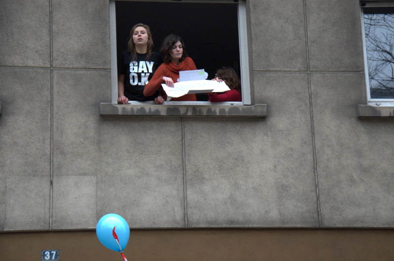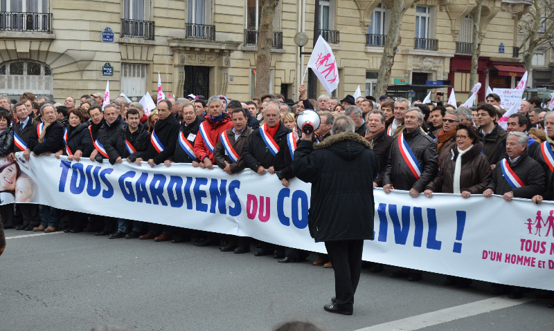 También hubo algunas contra manifestaciones que se realizaron pacíficamente aunque no dejó de aber onsultos de ambas partes. La organizacion ACT UP Paris tendió una banderola con la leyenda:"Homofobia = Muerte" en el puente de Luxemburgo, por donde pasó la manifestación rumbo a la Torre Eiffel.Entre 340.000 manifestantes, de acuerdo a la policía y 800.000 según los organizadores, marcharon hasta el pie de la Torre Eiffel, en la llamada de "Manifestación para todos"("Manif pour tous") que había establecido un objetivo mínimo de por lo menos 200,000 a 300,000 personas. Se trata de la mayor movilizacion de la derecha en torno a una cuestión social desde la manifestaciones en defensa de las "escuelas libres", que reunieron al menos 850.000 personas en París en 1984.