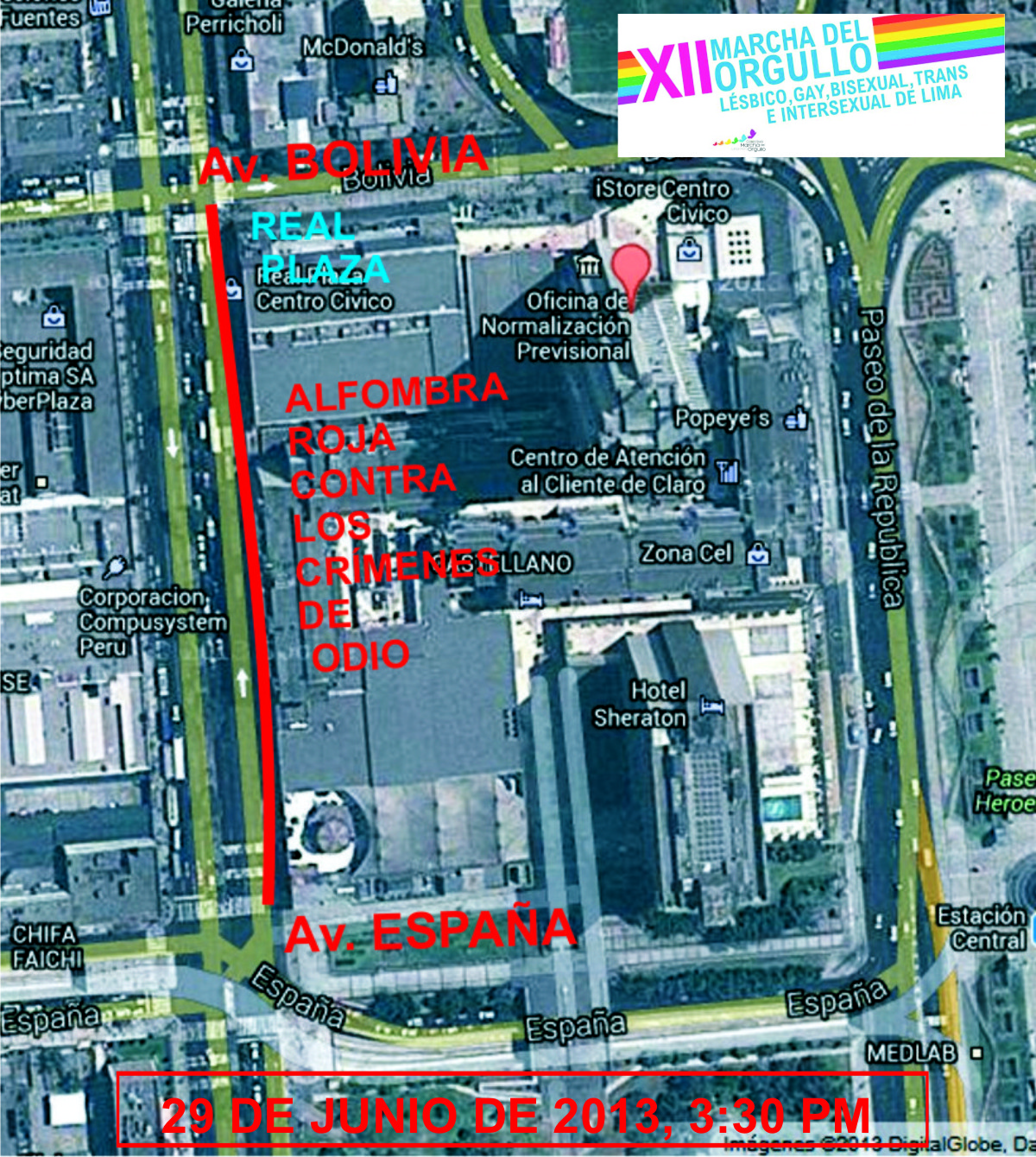 La cuadra 13 de la Av. Wilson (Garcilaso de la Vega), que colinda con el Centro Cívico (Real Plaza) -como se ve en la imagen que ilustra este post- será intervenida desde minutos antes de las 3:30 PM para que se realice allí la "Alfombra Roja", acción pública que busca hacer notar que el Estado peruano pisotea los derechos de la diversidad sexual, negándose incluso a defender su derecho a la vida, como se evidencia al excluir la orientación sexual y la identidad de género de la ley que busca incrementar las penas contra los delitos motivados por la discriminación (ley de crimenes de odio).