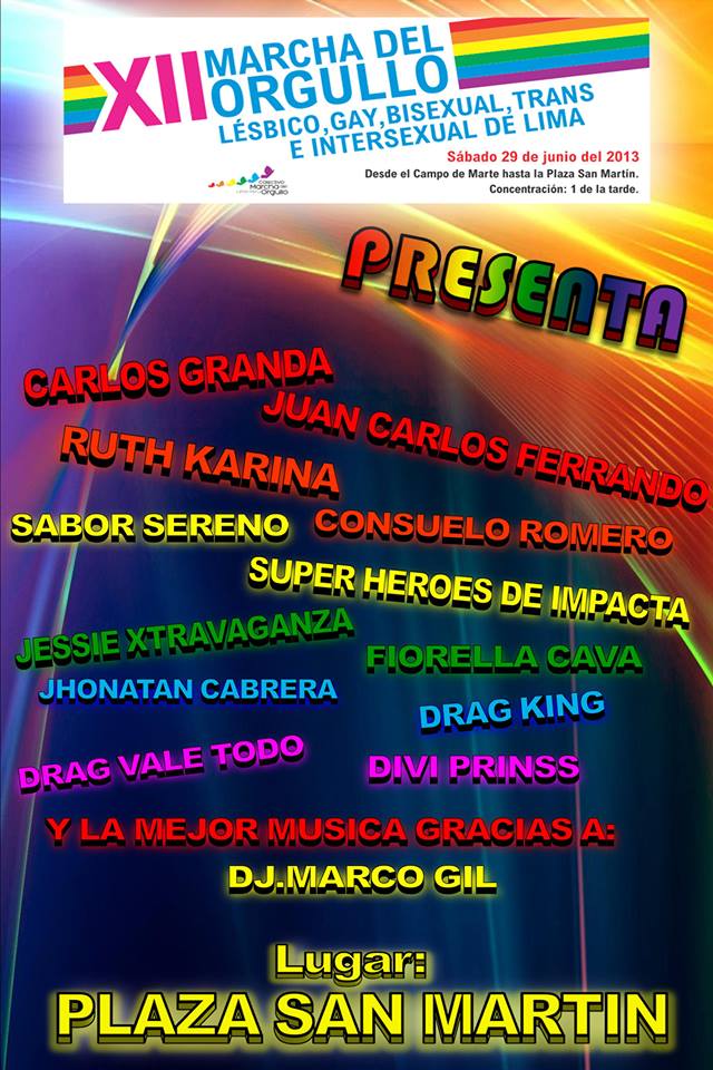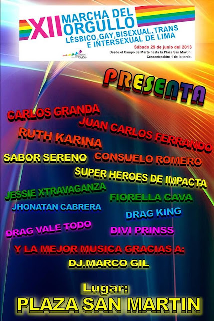 Esta tarde al concluir la Marcha del Orgullo en la Plaza San Martín se realizará un concierto/fin de fiesta en el que participarán consagrados de artistas de varios géneros musicales como Fiorella Cava (rock), Ruth Karina (cumbia), Consuleo Romero (trova) o Carlos Granda (criolla).