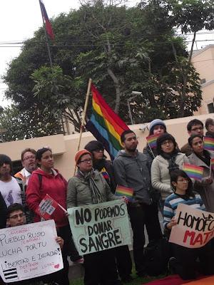 Más de medio centenar de activistas LGBT (lesbianas, gays, bisexuales y trans) se manifestó la tarde de hoy lunes frente a la Embajada Rusa en Lima contra las leyes que discriminan las y los LGBT rusos y contra la homofobia promovida por el gobierno de ese país.